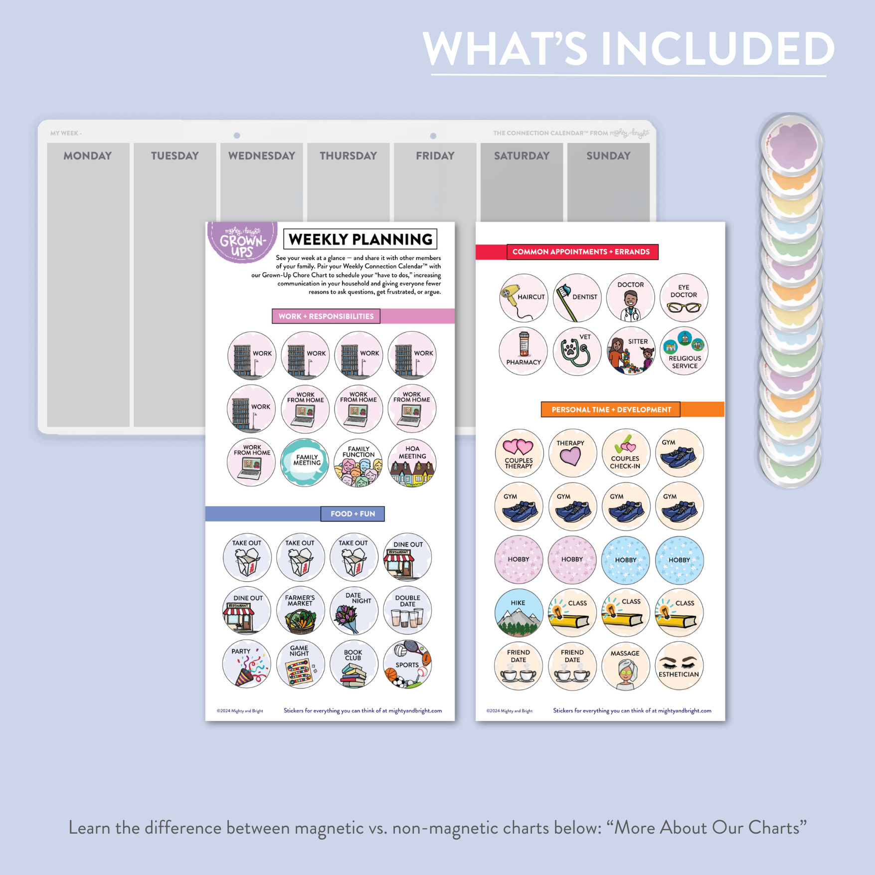 • Reusable Sticker Sheet, which includes 53 reusable stickers for use with your Mighty + Bright calendar: