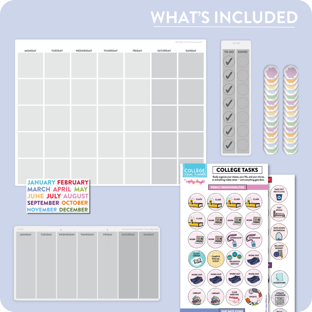 - Set of two "College Tasks" reusable sticker sheets, which includes 76 stickers (20 small due date icons and 56 regular size), split up into four categories: