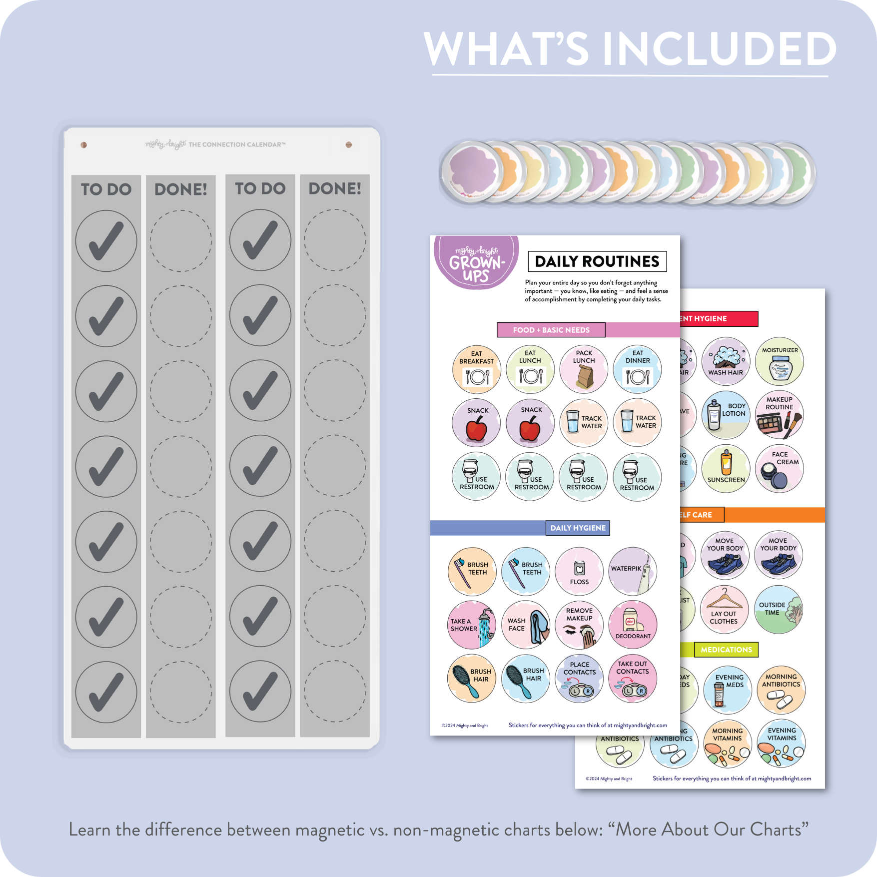 They're also thoughtfully designed. Every aspect of these charts — from the neutral color of the chart itself to our exclusive method of using reusable stickers — is intentional. They're strategically designed to be engaging, so they actually get used long-term. They may look simple, but that's because we've taken all the guesswork out of it for you, so you're ready to go in fifteen minutes.
