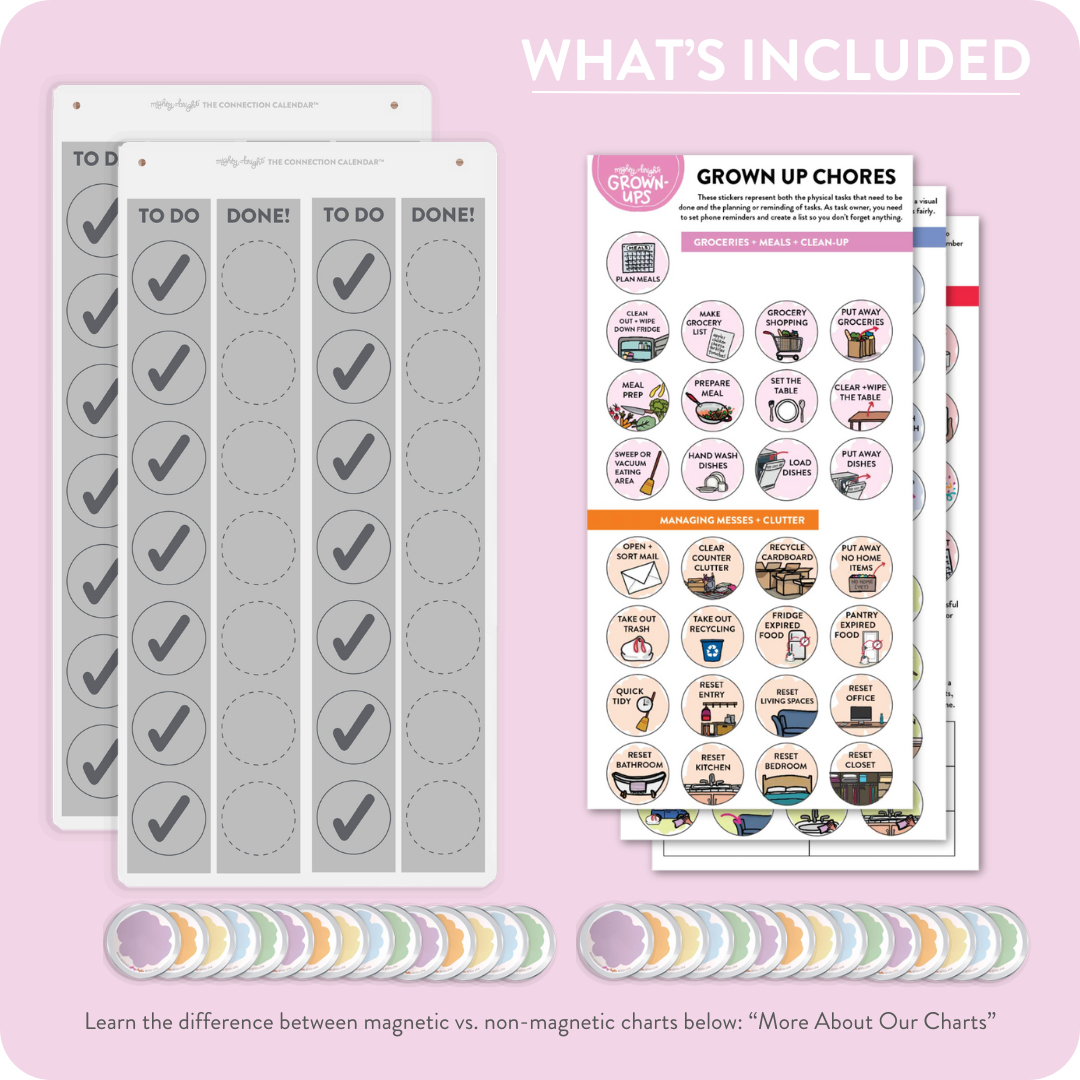 - Set of three "Division of Labor and Chores" reusable sticker sheets, which includes 83 total stickers, split up into color-coded categories: