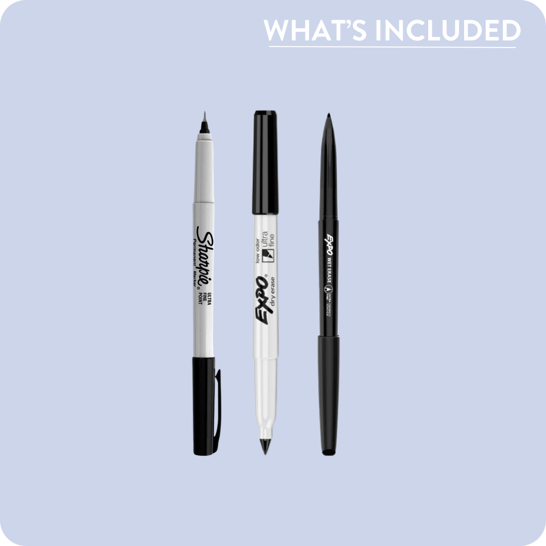 Wet erase: wet erase is a great middle ground between dry erase and Sharpie — it can easily be removed with a wet cloth, but won't smudge like dry erase.