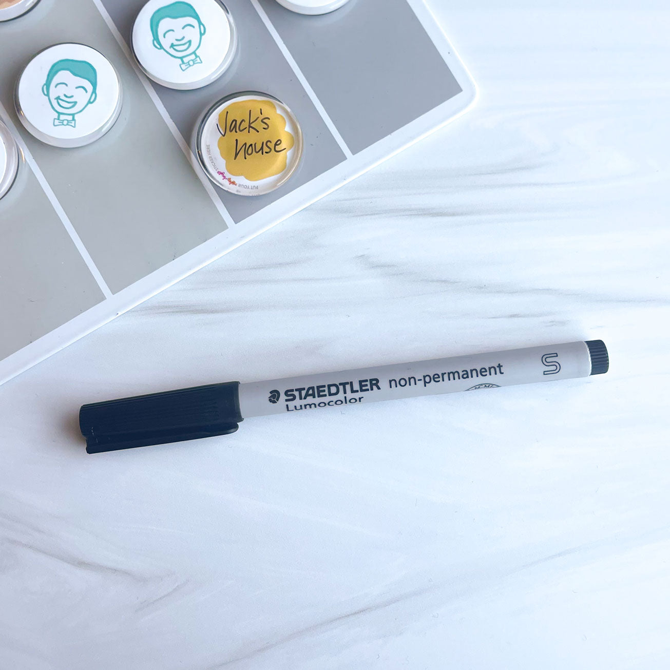 One black Staedtler Lumograph Non-Permanent Wet Erase Marker Pen, Super Fine Tip, Low Odor Marker. Dry-safe ink and tip means even if the cap's been left off for days, it remains usable. Wipes off easily with a damp cloth. Refillable, using Staedtler 487-15 refill jars.
